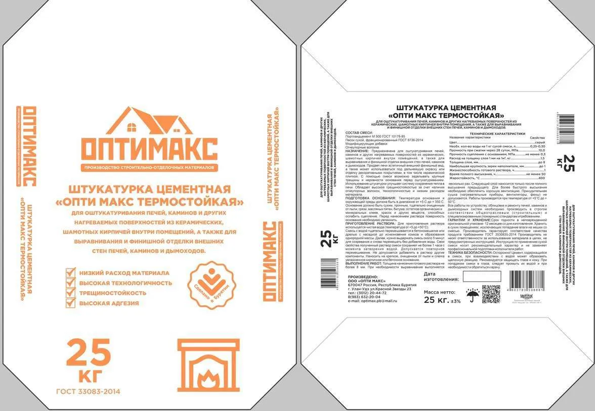 Штукатурка цементная "ОПТИ МАКС термостойкая" для оштукатуривания печей,каминов и других нагреваемых поверхностей из керамических,шамотных кирпичей внутри помещений, а так же для выравнивания и финишной отделки внешних стен печей,каминов и дымоходов.